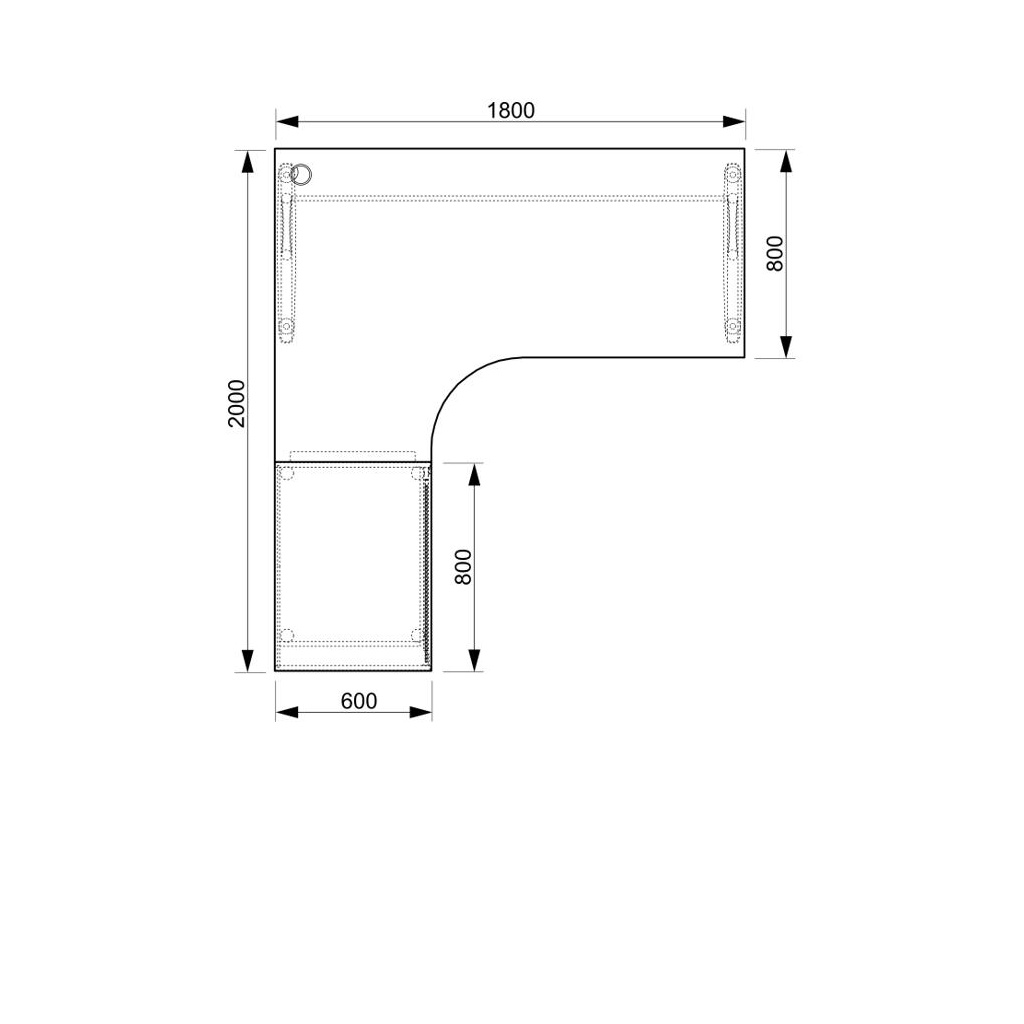 Stůl rohový levý se skříňkou Hobis Cross CE 1800 60 HR L, šířka 180 cm, výška 75,5 cm, hloubka 200 cm, nohy osazeny rektifikací. 1x kabelová průchodka, příchytky...